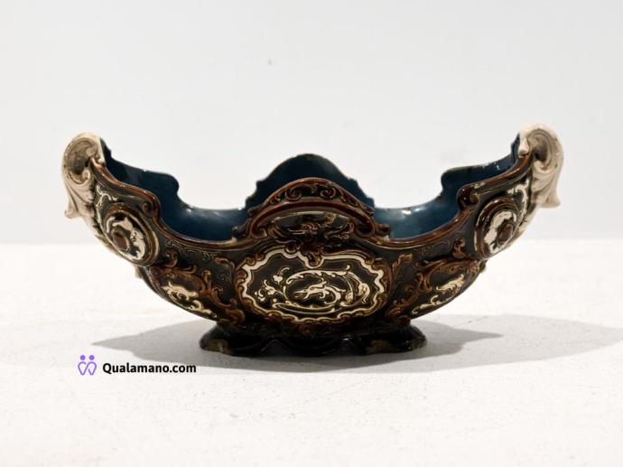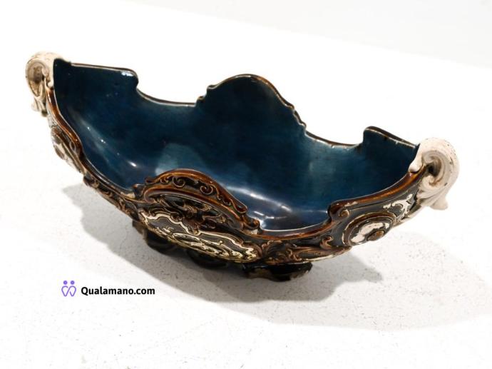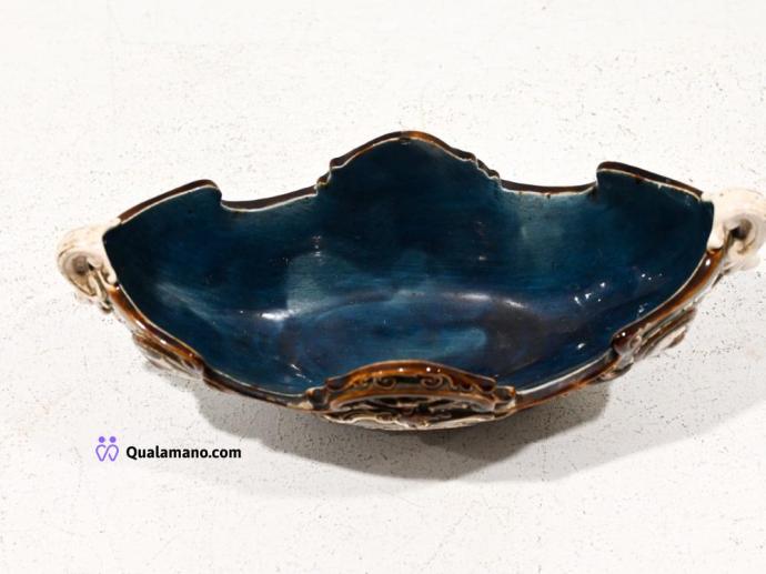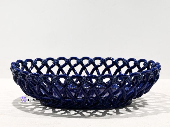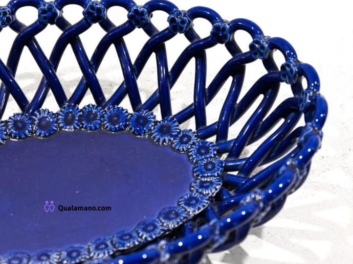 N. 1 Centrotavola ovale in ceramica blu cobalto, lavorato a intreccio con bordo floreale in rilievo....