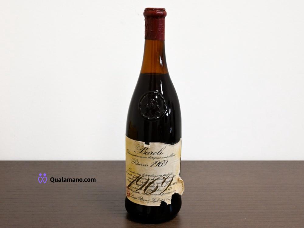 N. 1 Bottiglia storica di Barolo Riserva, vendemmia 1969, prodotta da Luigi Bosca & Figli. Vino a Denominazione di Origine Controllata, etichetta parzialmente deteriorata ma leggibile. Incisione in rilievo sulla bottiglia con stemma. 72cl, vol 13,5%