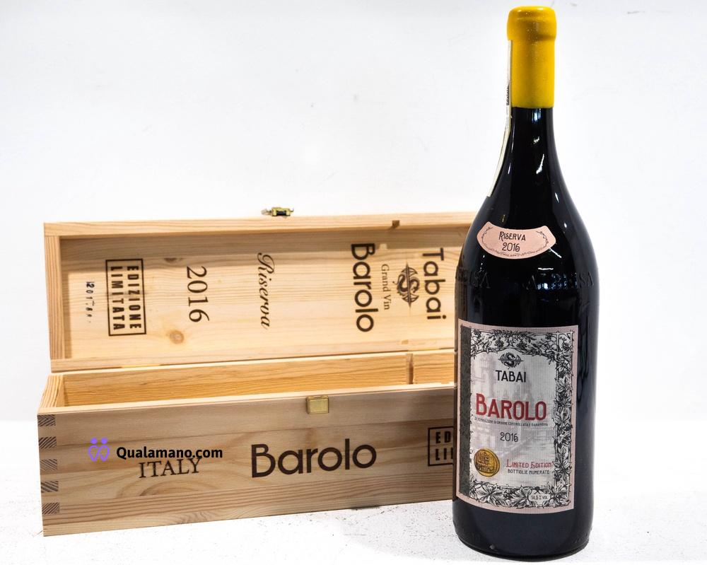 Bottiglia Magnum 1,5L di Barolo Gran Vin Tabai, Riserva 2016 in edizione limitata n. 201-8888, vol.14,5% DOCG. È presente la confezione in legno.