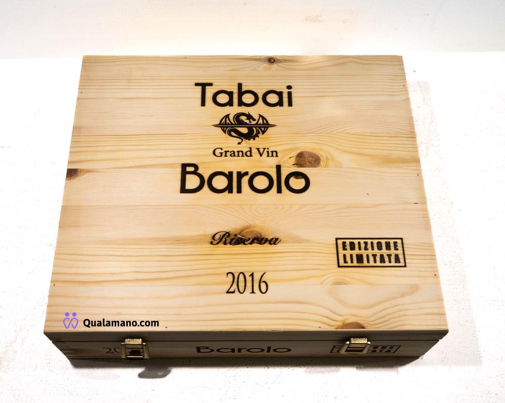 Cassetta di legno contenente n.4 bottiglie (0,75L) di Barolo Gran Vin Tabai, Riserva 2016 in edizione limitata, vol.14,5% DOCG.Bottiglia numerata: 1194/8888Confezione in legno.