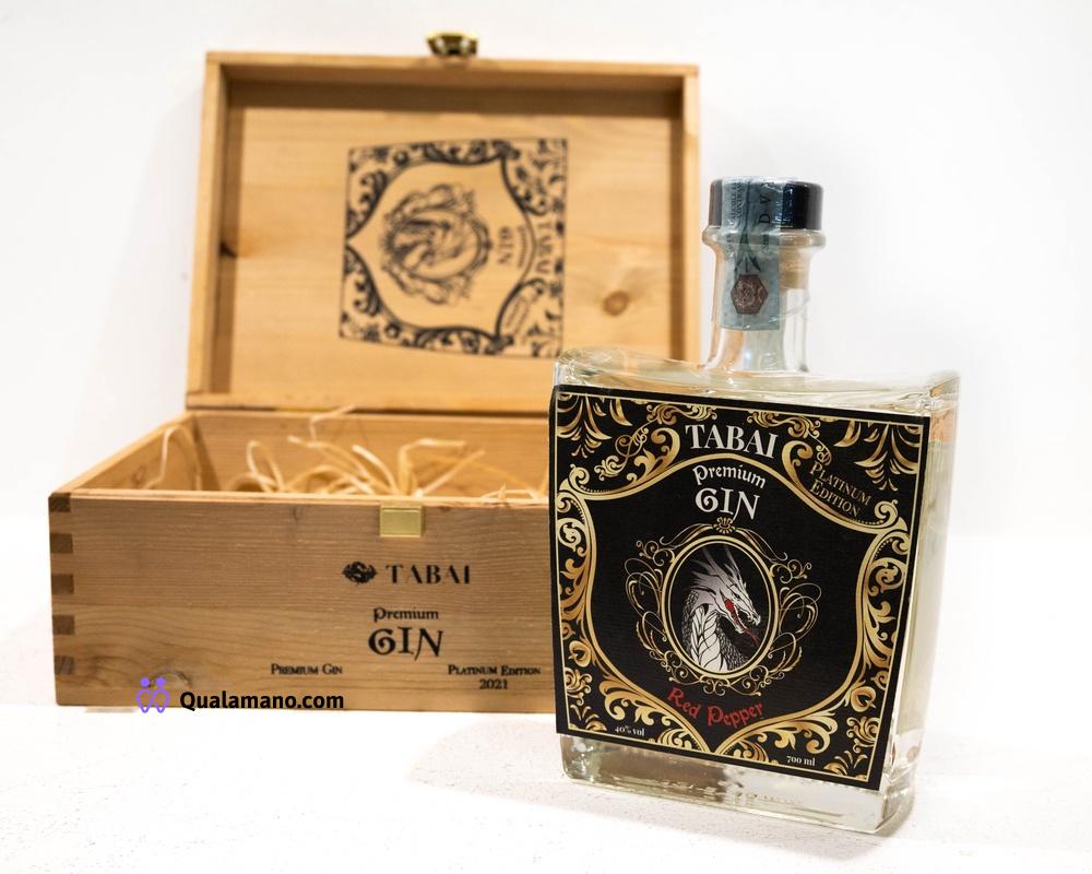 Bottiglia di Premium Gin Tabai, Red Pepper, Platinum Edition. 70 cl, 40% vol.Gin caratterizzata da una miscela di bacche di ginepro, liquirizia, pepe rosso e pino mugo, con note calde e afrodisiache del pepe rosso,Produzione limitata, bottiglia n. 926411. Completo con cofanetto in legno.