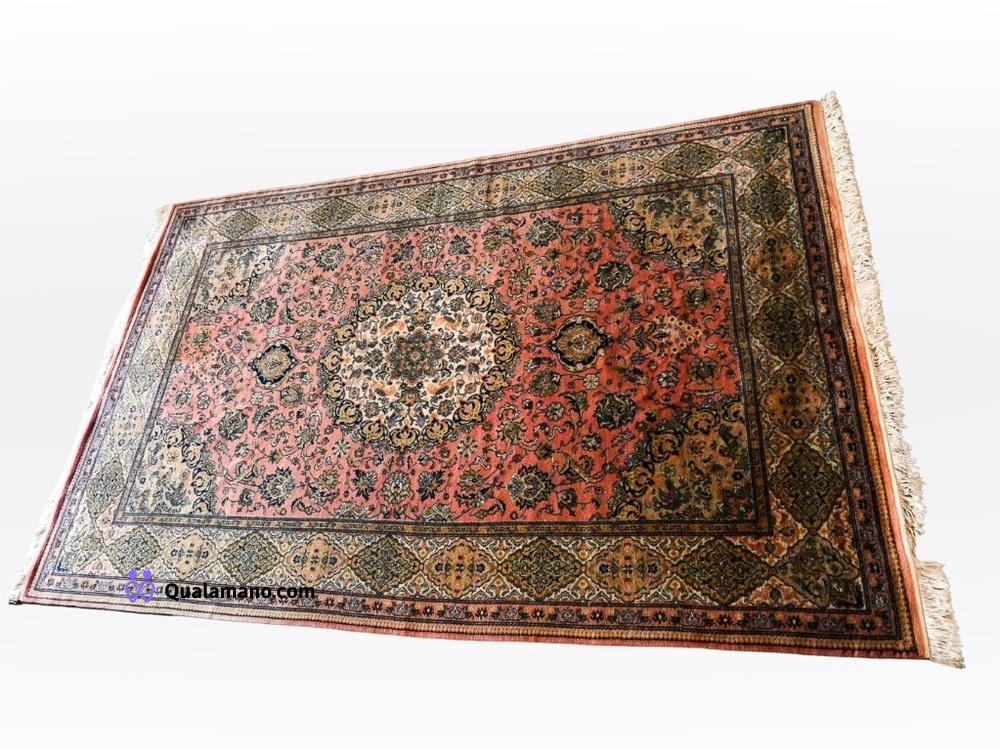 N. 1 Tappeto di tipo persiano con medaglione centrale a rosetta, sfondo rosa antico e raffinati motivi floreali verde oliva e avorio. Dimensioni 200x300cm