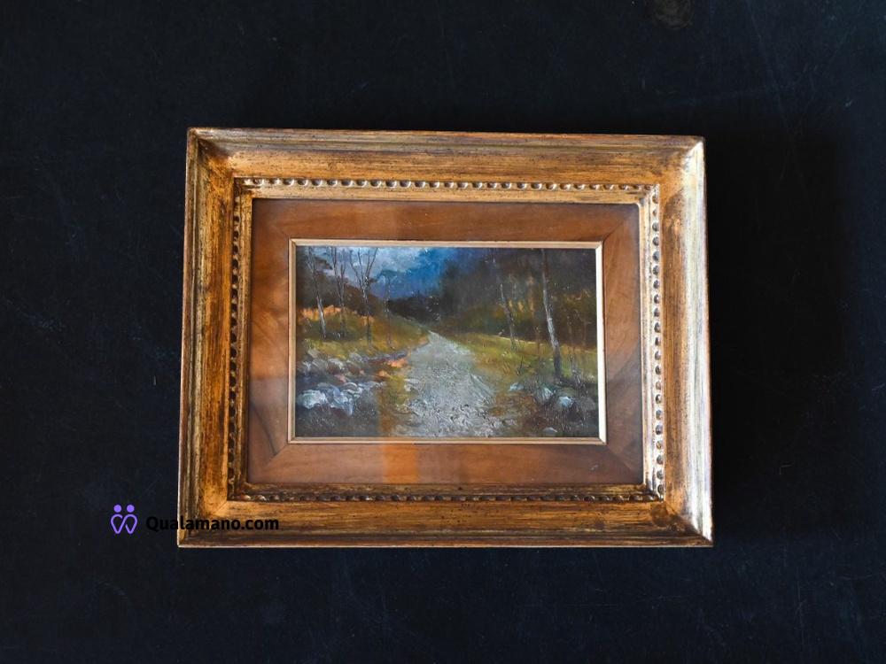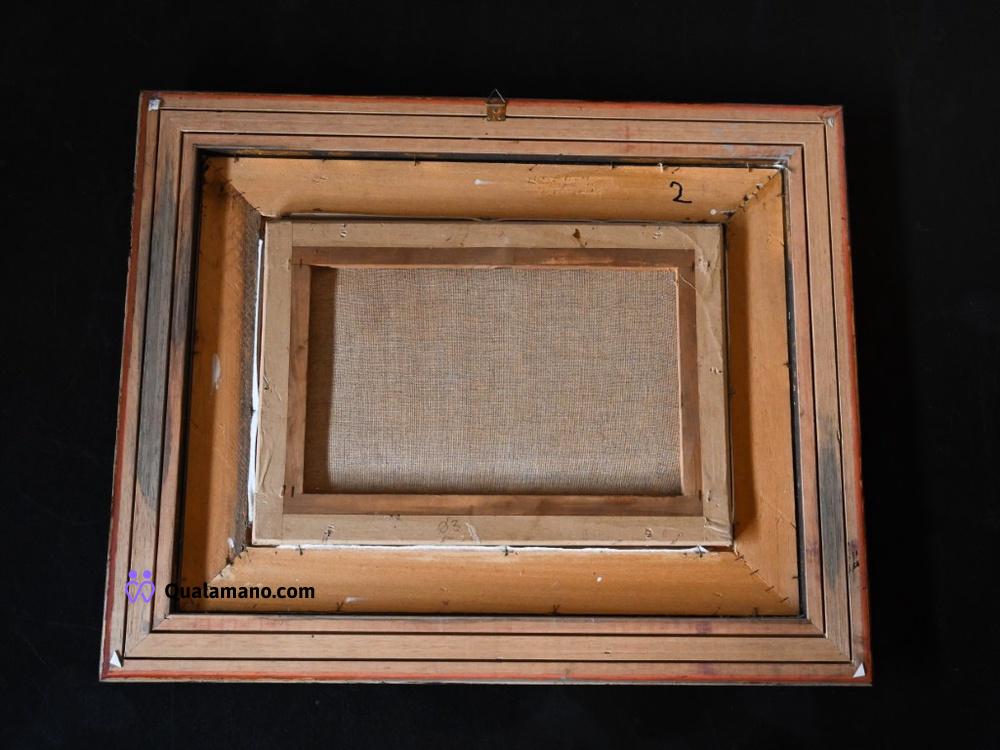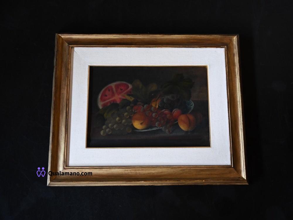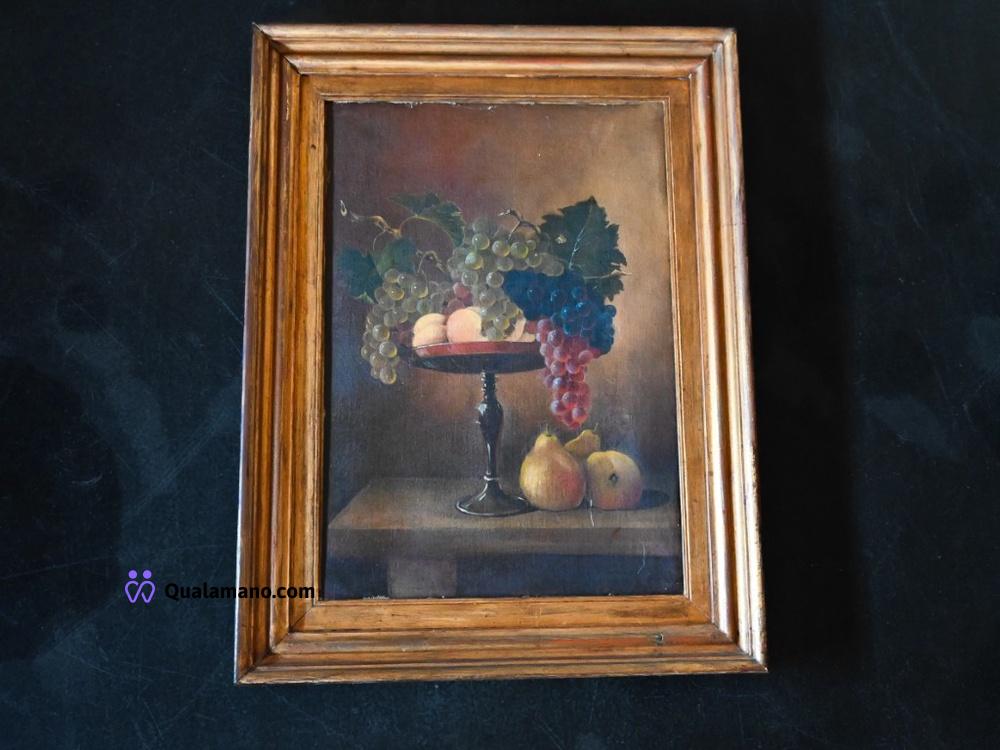 N.1 quadro raffigurante natura morta ad olio con frutta su coppa in vetro, ambientata su sfondo scuro e cornice in legno dorato a rilievo. Etichetta originale della corniceria “Antichità Restauro Bertoncello” con dettagli dell'opera: “Natura morta”, tecnica olio su tela, fine ’800. Dimensioni con cornice 63x48 cm