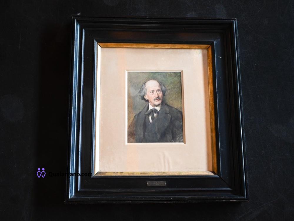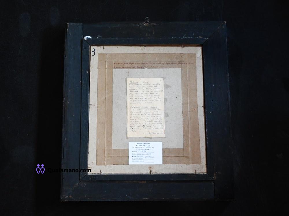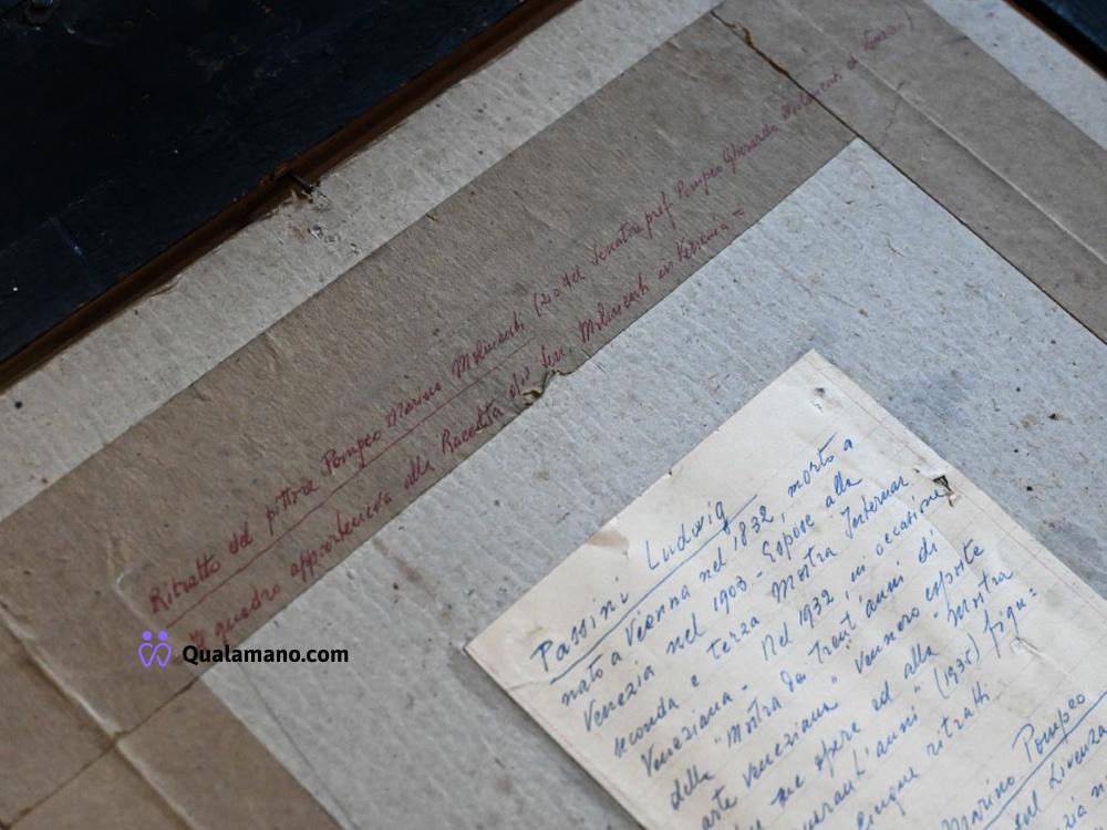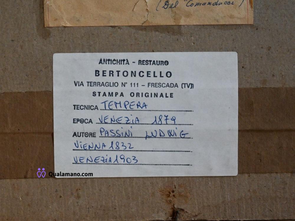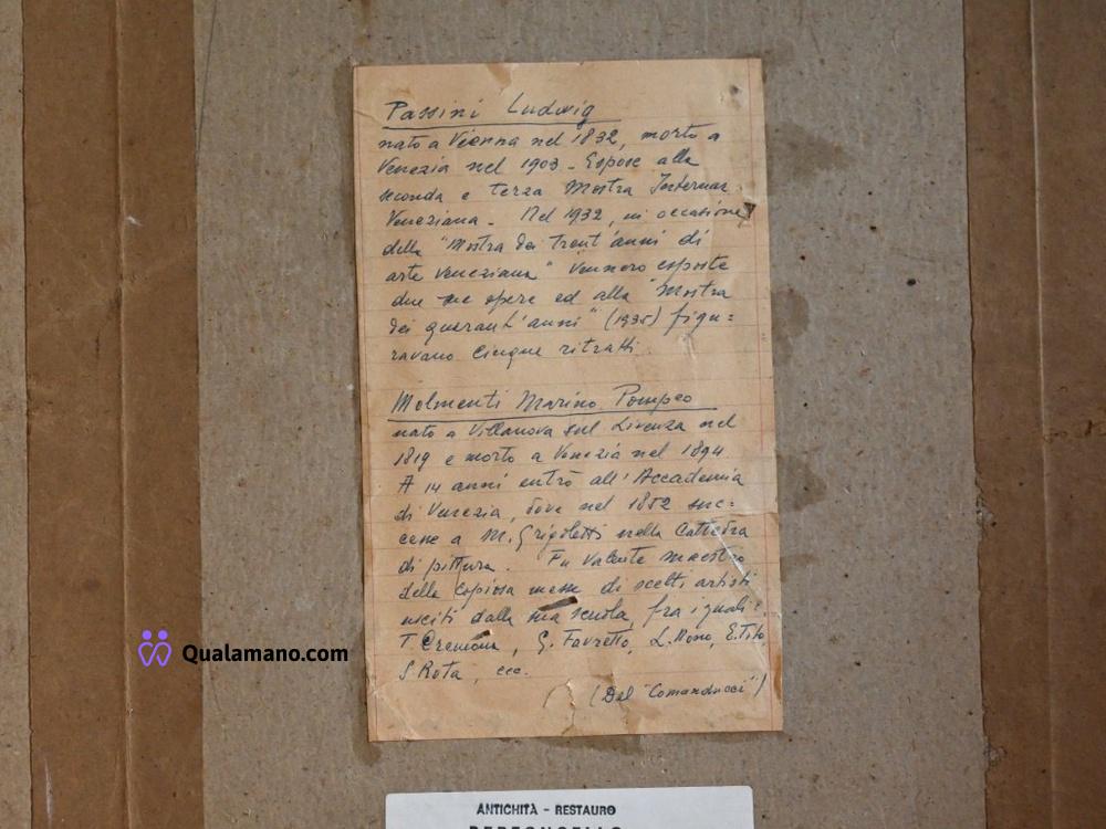 N.1 ritratto maschile antico firmato attribuito a Ludwig Passini (1832–1903), raffigurante Pompeo Marino Molmenti, in cornice nera con bordo dorato e targhetta. Restauro eseguito da “Antichità Restauro Bertoncello”. Al retro, lettera manoscritta con note genealogiche e riferimenti alla provenienza dell’opera. Dimensioni con cornice 63x57 cm