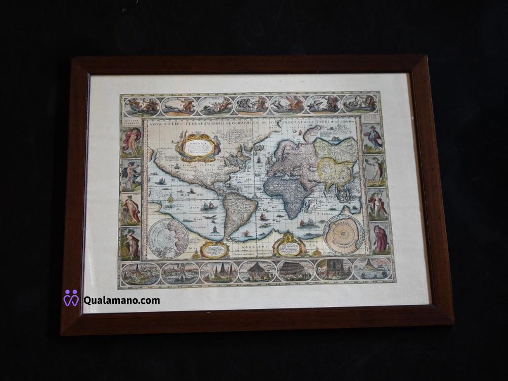 N. 1 mappa antica del mondo incorniciata, con colorazione a mano, dettagli geografici e mitologici, contorni figurati e scene allegoriche sui margini. Cornice restaurata da “Antichità Restauro Bertoncello”, rivestita con carta decorativa floreale rossa e crema Dimensioni con cornice 83x63 cm