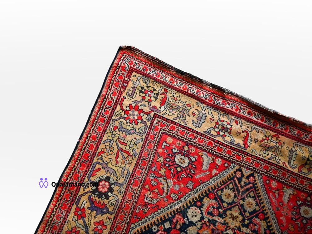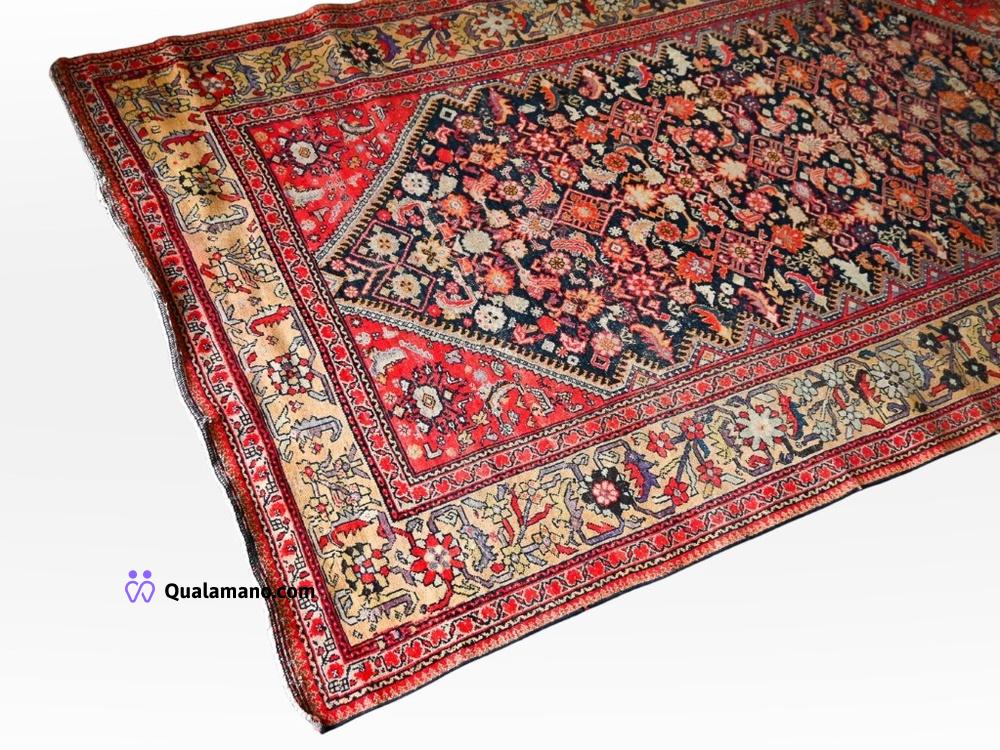 N. 1 Tappeto di tipo persiano, con campo centrale scuro decorato da motivi floreali e cornice rossa a medaglioni. Bordi frange rotti. 10,6kg. Dimensioni 175x315cm.
