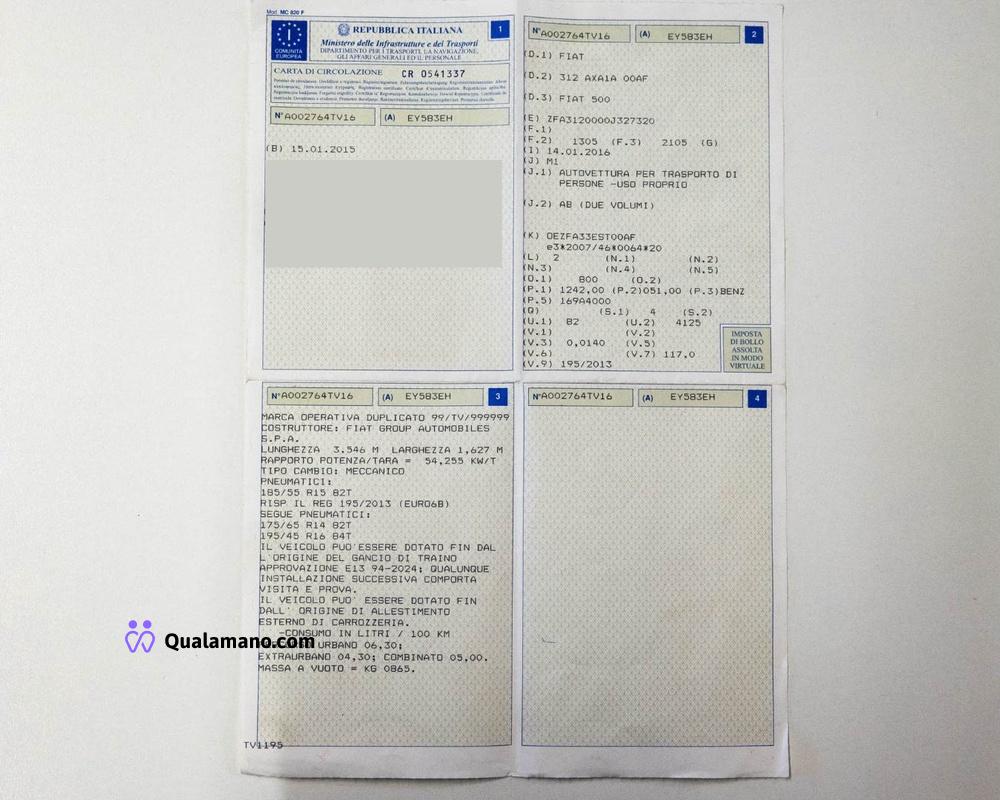 Autovettura Fiat 500 (autovettura per trasporto di persone), targata EY583EH, data di immatricolazione 15.01.2015, cilindrata cm3 1242, potenza 051 kw, alimentazione a benzina (euro 6B), n. 4 posti a sedere. Ultima revisione regolare effettuata in data 23/01/2025 con rilevati 43.784km. in sede di revisione. Kilometri rilevati sul cruscotto 45.768km.Veicolo completo di n.2 chiavi, della carta...