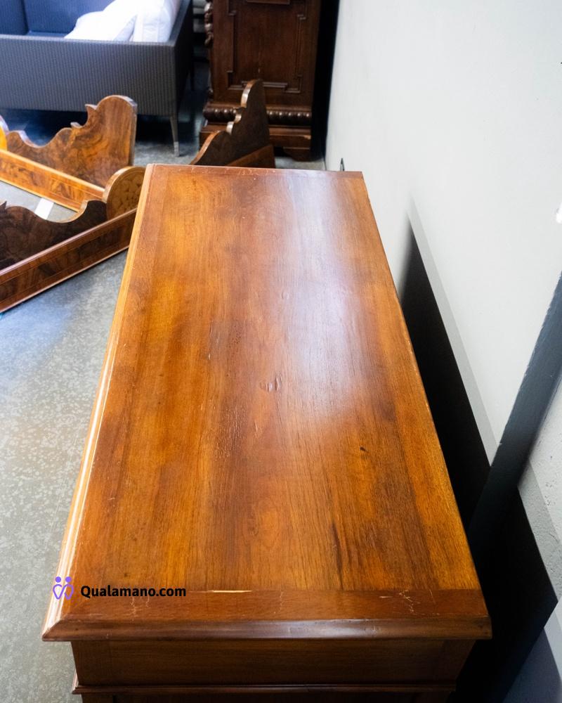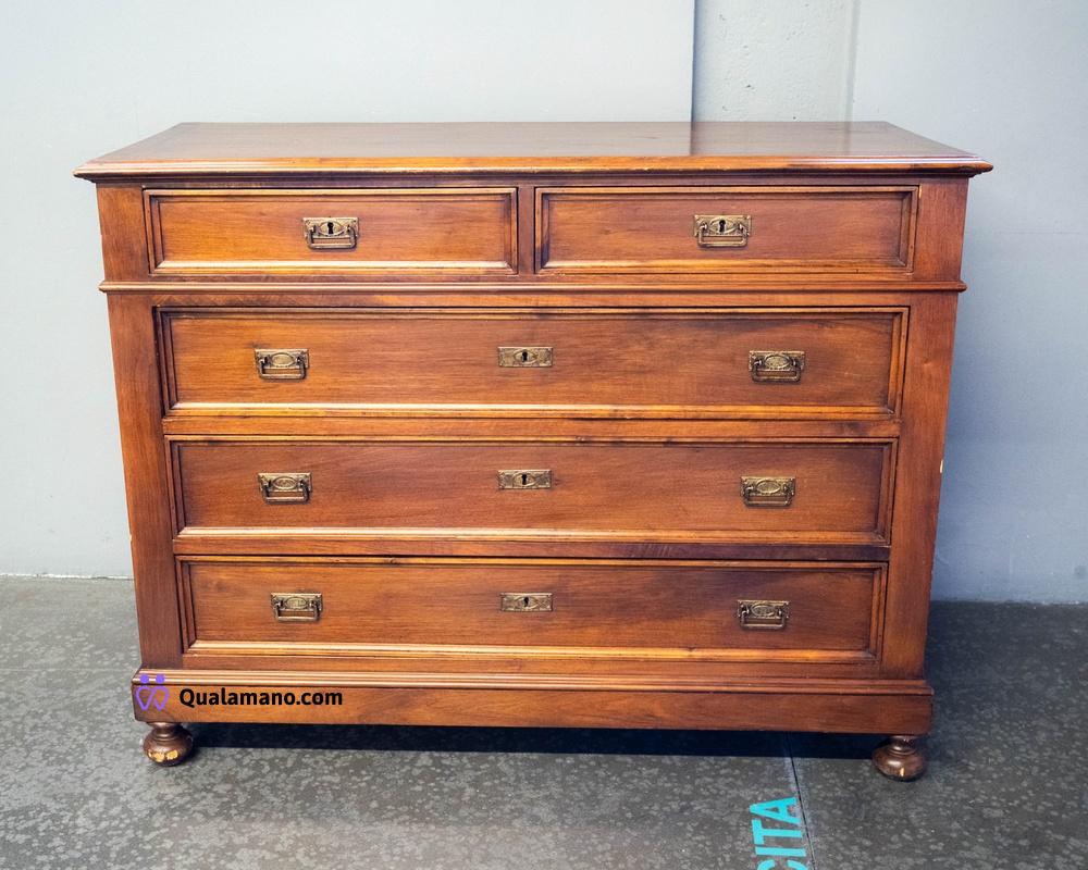 Cassettiera in legno d’epoca – 6 cassetti – ferramenta in ottone stile liberty- piedi a cipolla – misura 135x52x108cm – presenta segni d’usura