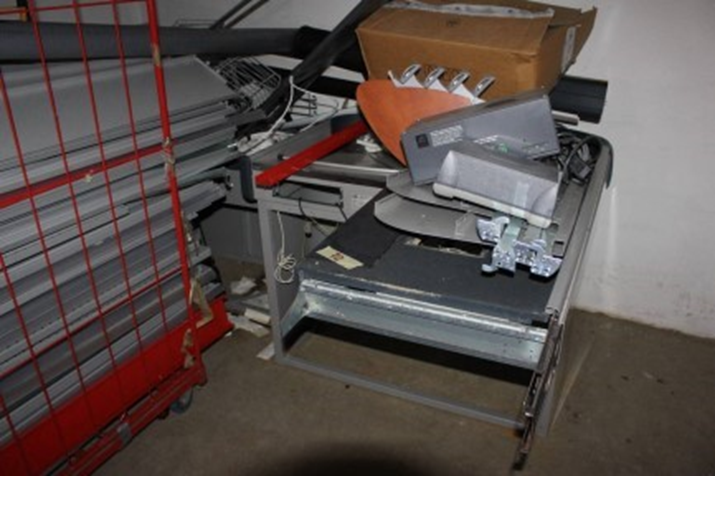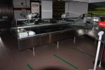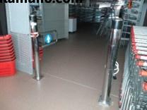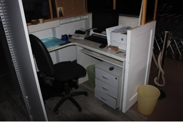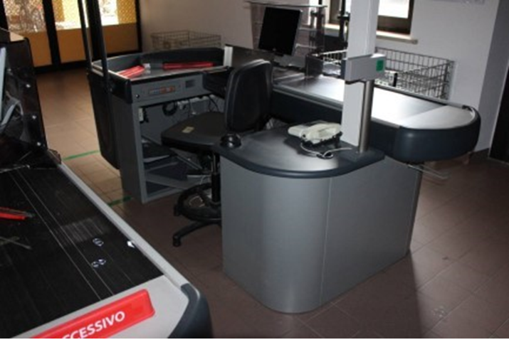 N.2 banchi cassa con configurazione a barriera, completi di nastro trasportatore, cassetto, lettore di codici a barre, sensore antitaccheggio e bilancia;