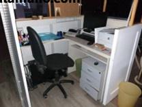 Scrivania angolare porta pc e cassettiera in laminato bianco, sedia ufficio in tessuto nero con ruote pivottanti, calcolatrice Olivetti Logos 692, accessori scrivania;