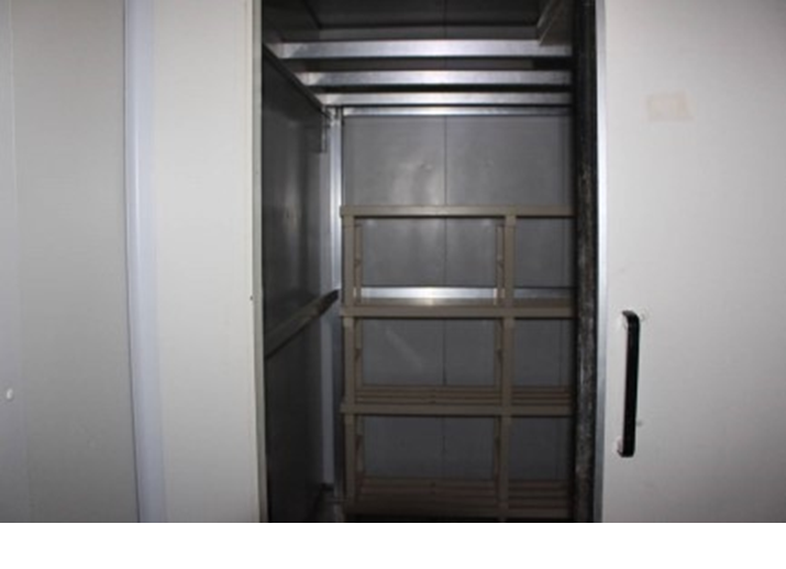 Cella frigorifera a 2 vani separati da porta, doppio impianto frigorifero marca ARNEG – temperature +4°C e -1°C - composta da pannelli modulari isolati spessore 6 cm, con pavimento isolato e rivestito in acciaio inox, illuminazione interna, dimensioni utili 1° vano 188 x 100cm x h 244cm, dimensioni utili 2° vano 188 x 202cm x h 244cm (dotato di telaio appendi carni).
