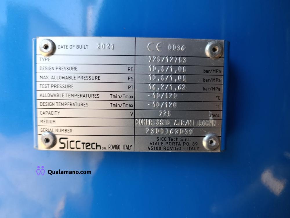 Serbatoio per aria compresso marca SICC Tech S.r.l., anno di costruzione 2023, tipo 725/12783, capacità 725 litri, n. seriale 2300363039.