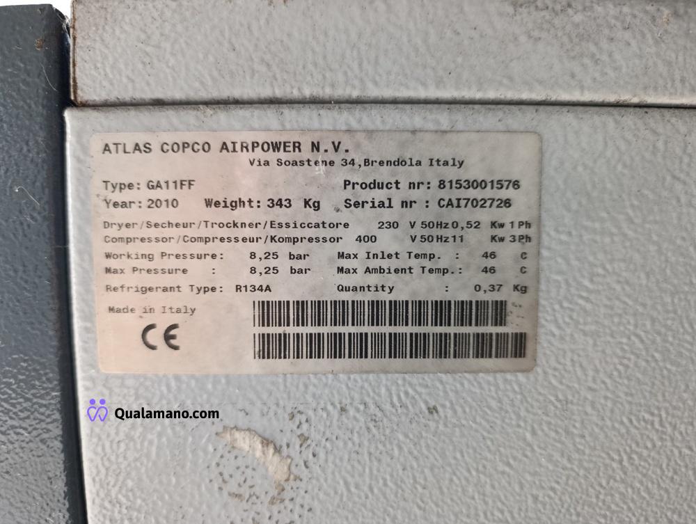 Compressore Atlas Copco type GA11FF, anno di costruzione 2010, peso macchina 343 kg, n. seriale CAI702726, n. produzione 8153001576;