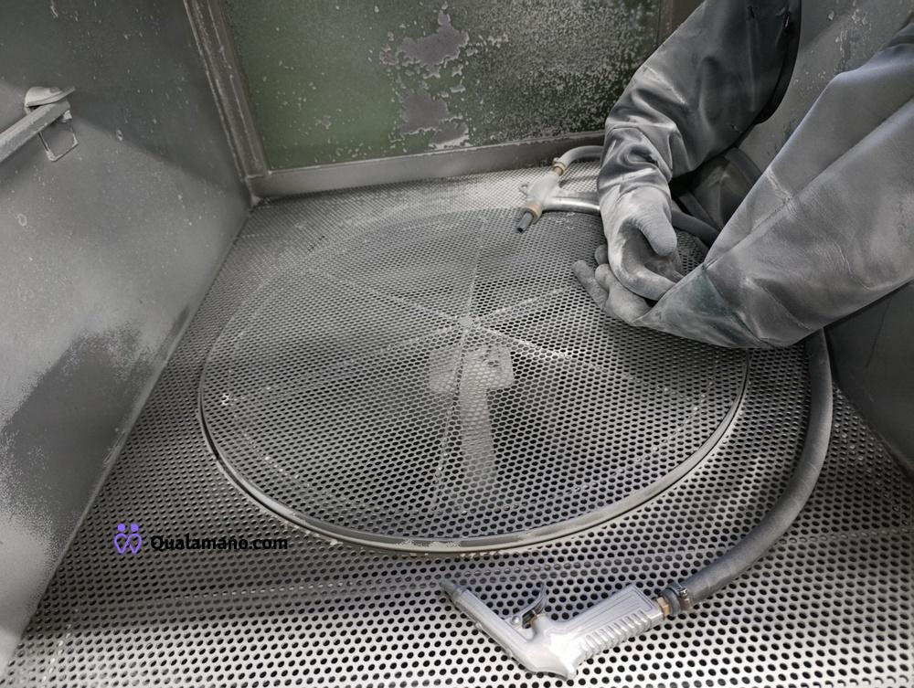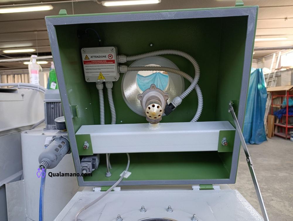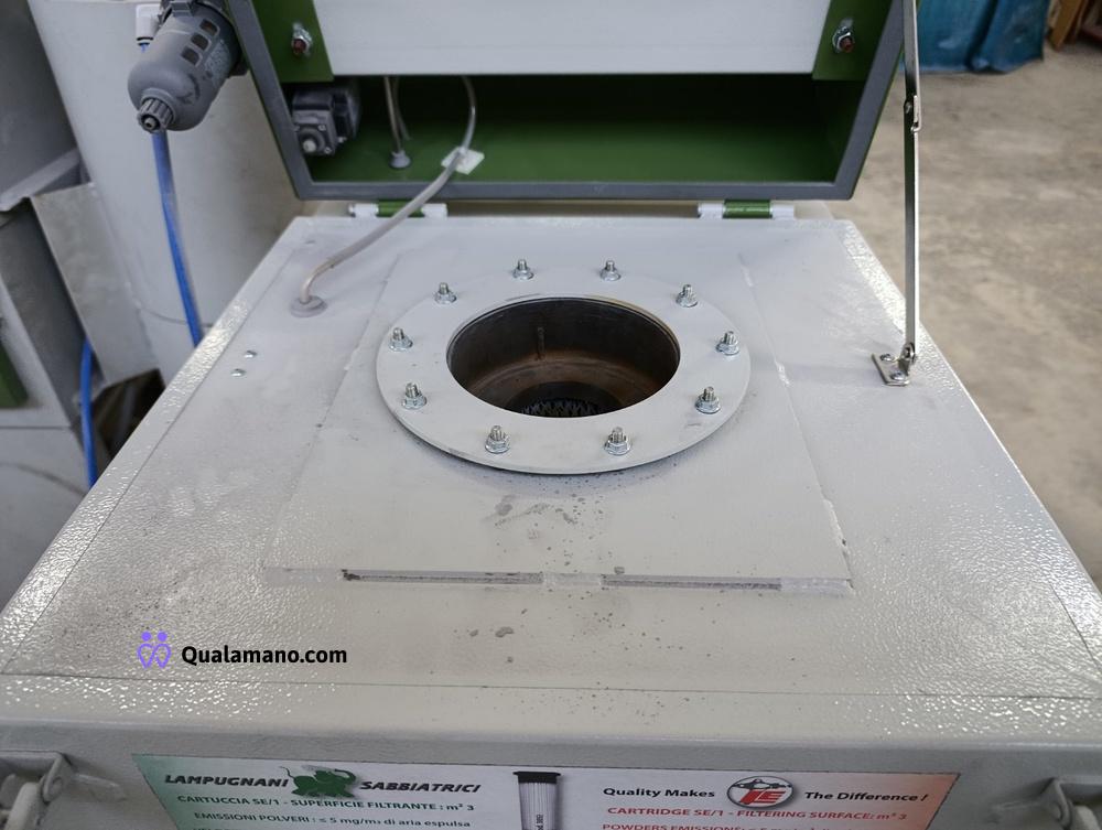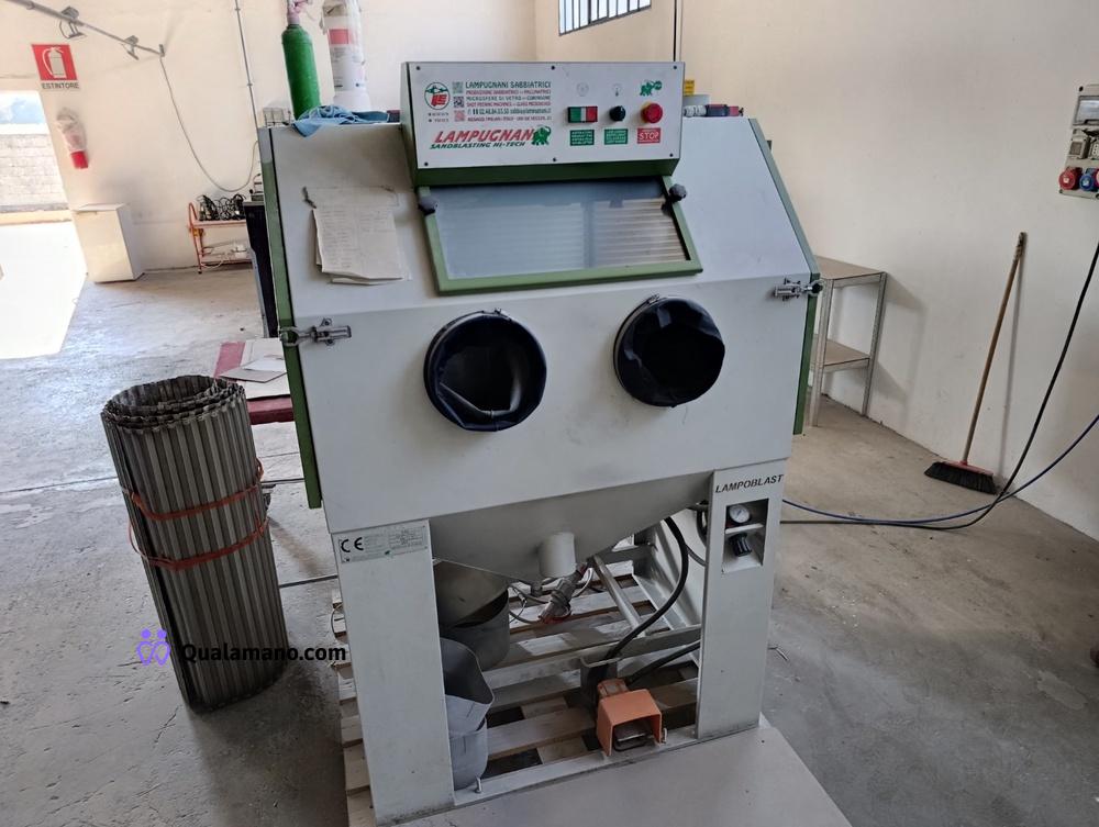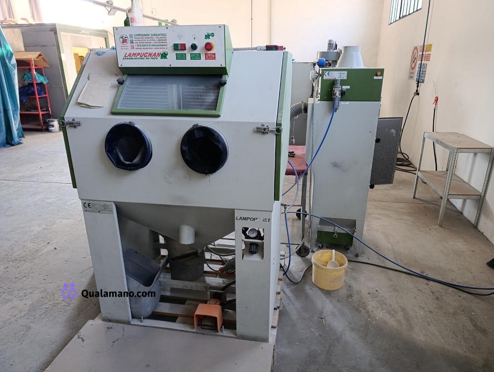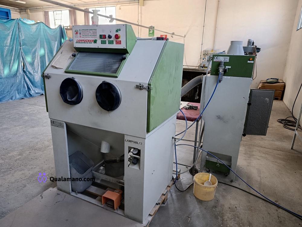 Sabbiatrice marca LAMPUGNANI SABBIATRICI S.r.l., modello LC/2TR (LAMBOBLAST), matricola 10.110, anno di costruzione 2018, dimensione postazione da lavoro mm 1100x800x700 h, tensione di collegamento Volt 400/240, 3F+N, frequenza 50 HZ, lavoro in pressione, completa di filtro a cartuccia e armadio aspirante modello SE 1, pressione max 0,5Mpa (5bar), matricola 10290, anno 2023 (all’interno piatto rotante).