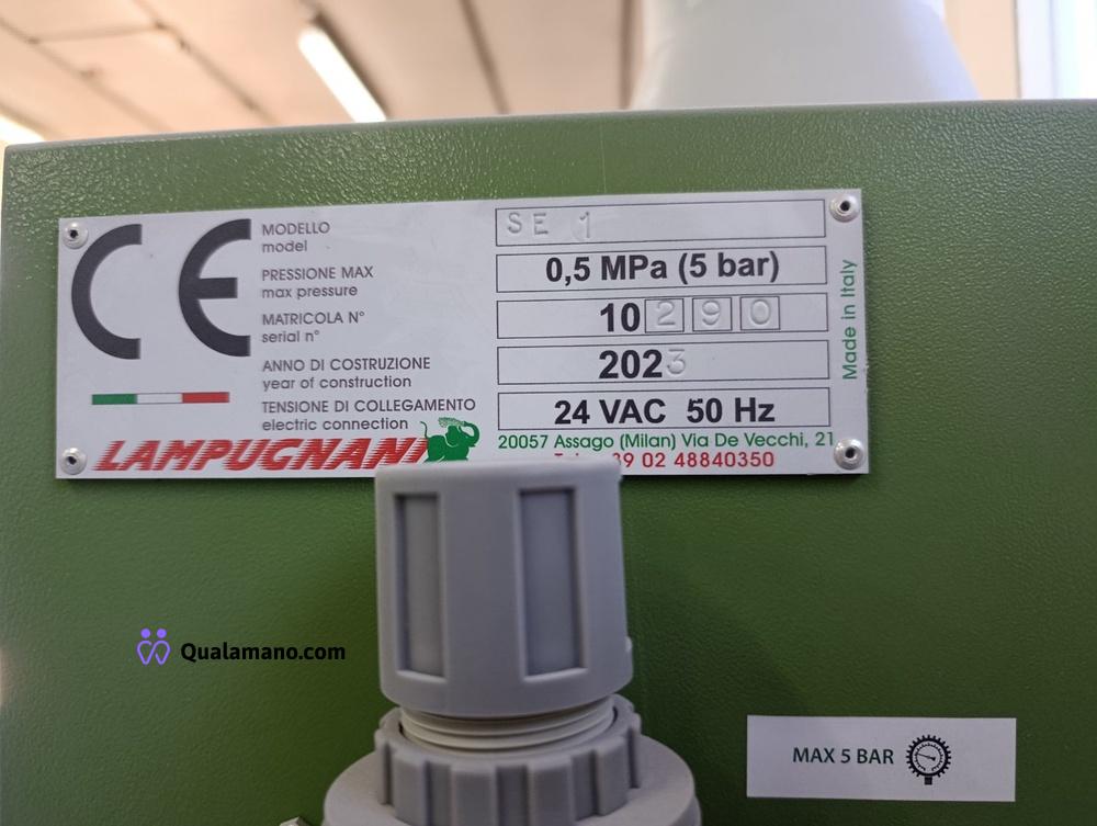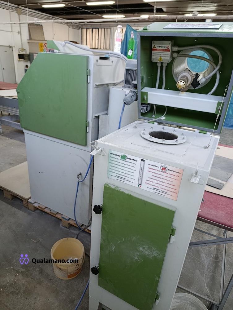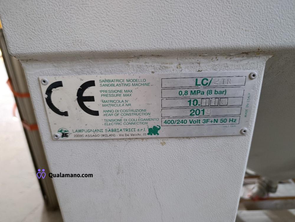 Sabbiatrice marca LAMPUGNANI SABBIATRICI S.r.l., modello LC/2TR (LAMBOBLAST), matricola 10.110, anno di costruzione 2018, dimensione postazione da lavoro mm 1100x800x700 h, tensione di collegamento Volt 400/240, 3F+N, frequenza 50 HZ, lavoro in pressione, completa di filtro a cartuccia e armadio aspirante modello SE 1, pressione max 0,5Mpa (5bar), matricola 10290, anno 2023 (all’interno piatto...