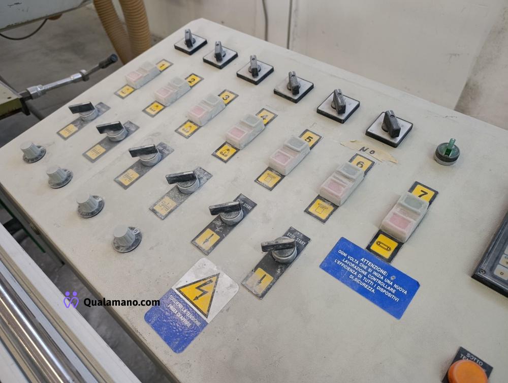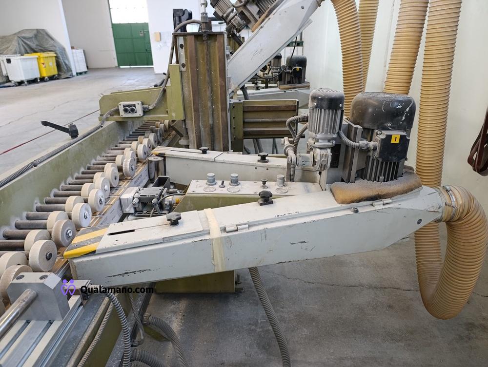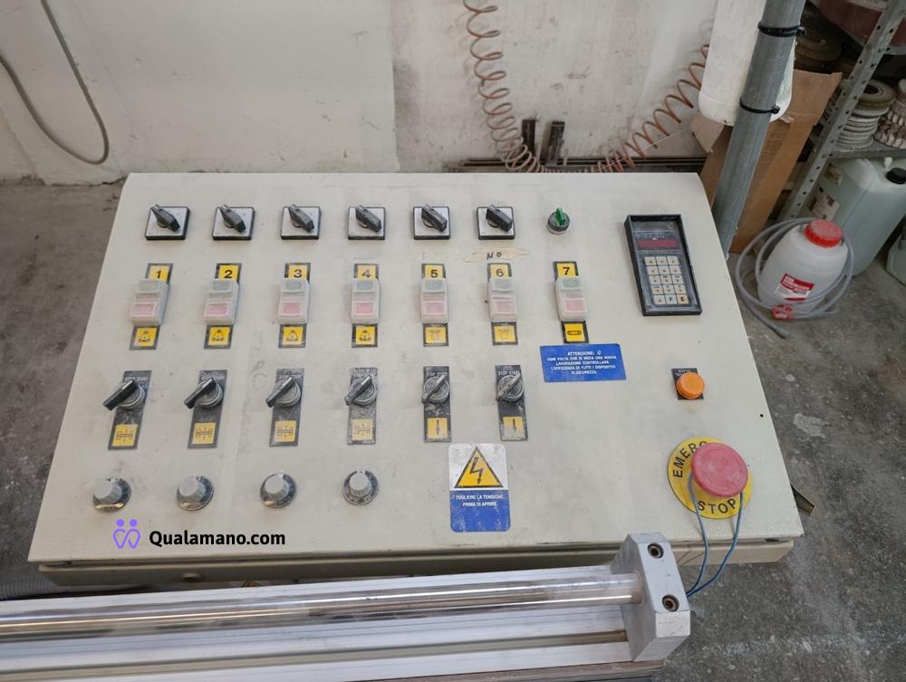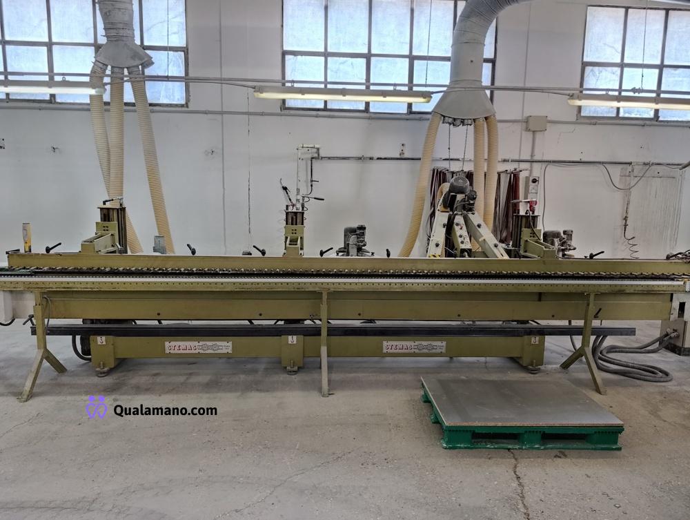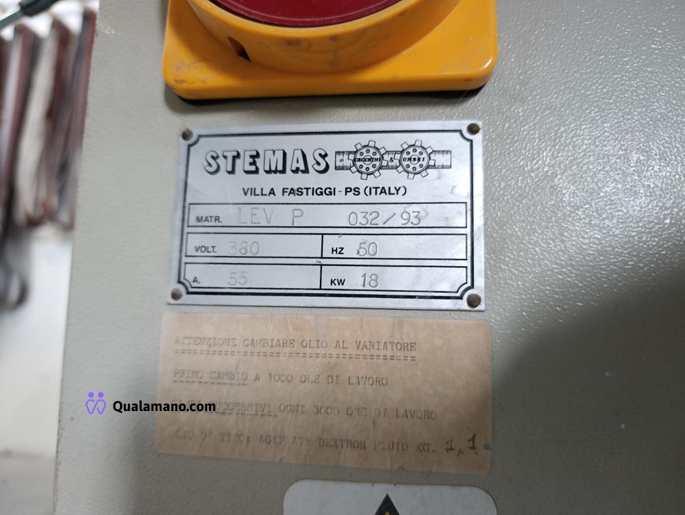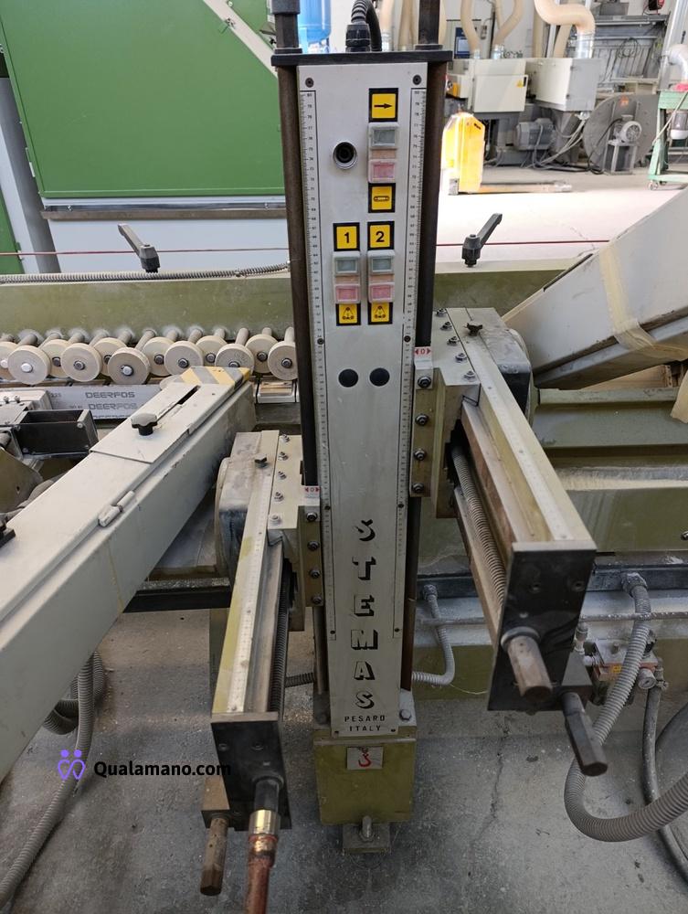 Macchinario levigabordi marca STEMAS, matr. LEV P 032/93, da 7 metri di lavoro, anno 1991, composta da 4 gruppi di levigatura su tre assi con regolatori di velocità ed entrata in funzione a tempo, n. 2 mole su tre assi con entrata in funzione a tempo e quadro comando.