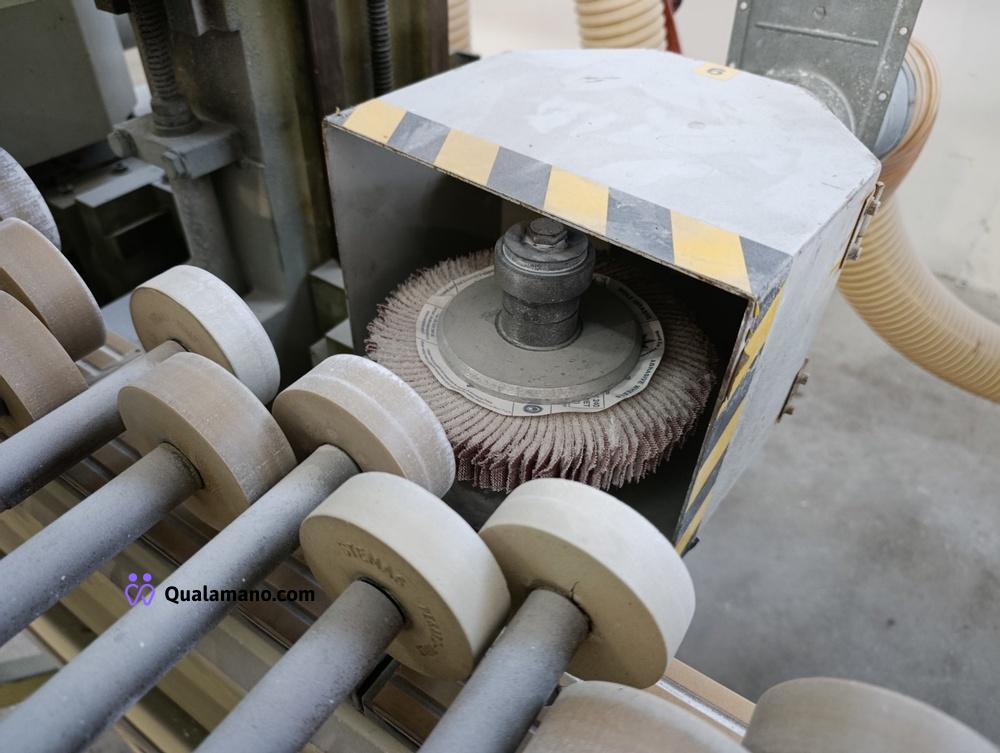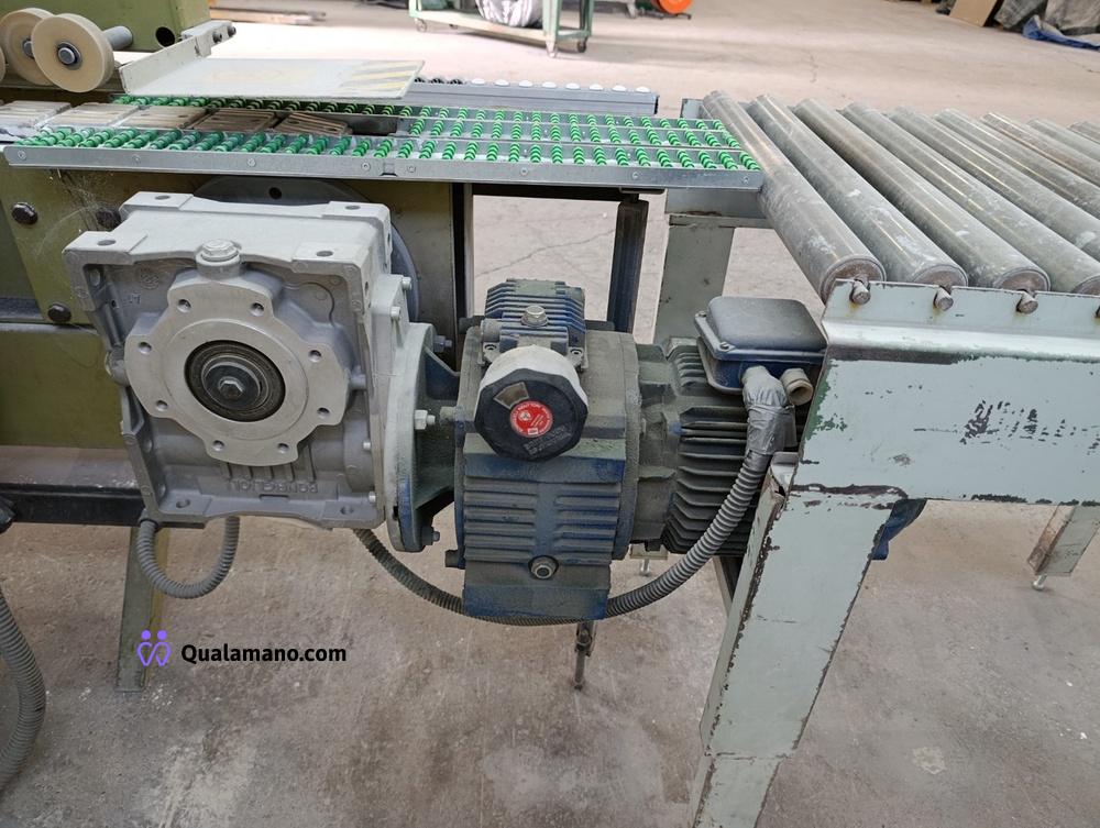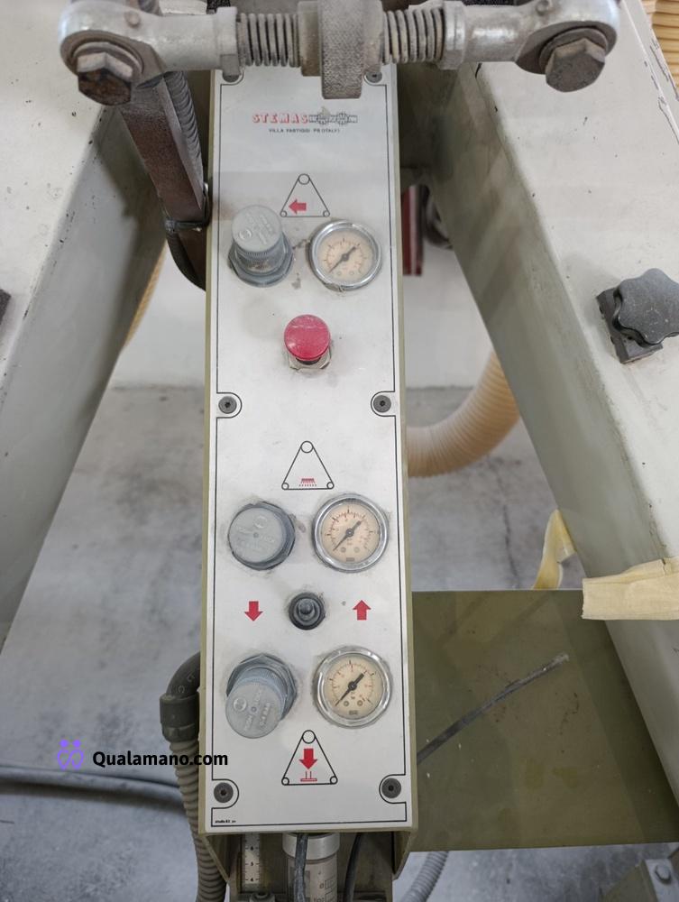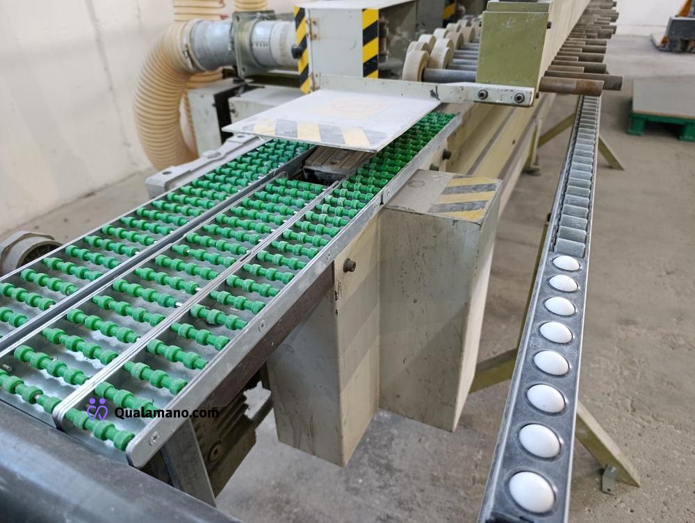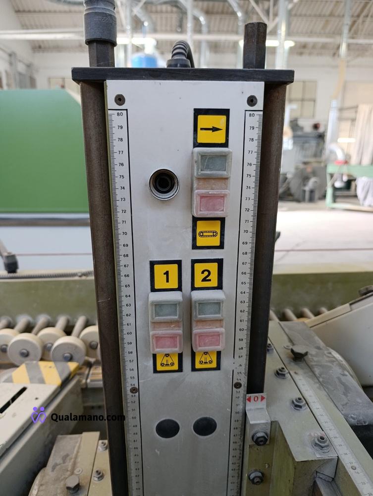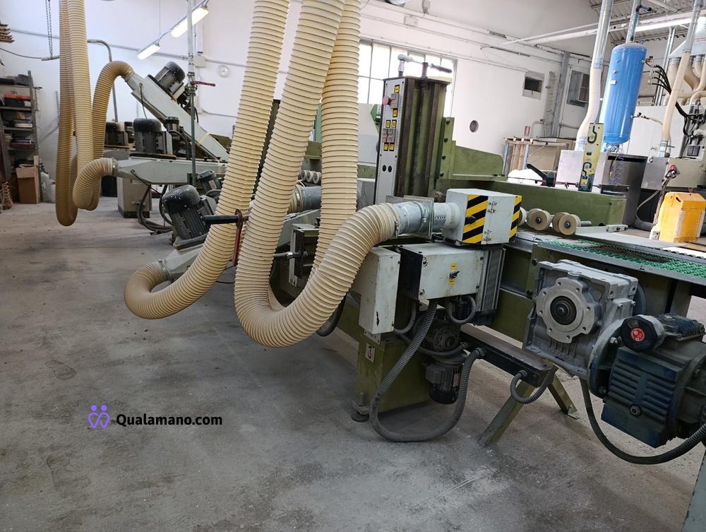 Macchinario levigabordi marca STEMAS, matr. LEV P 032/93, da 7 metri di lavoro, anno 1991, composta da 4 gruppi di levigatura su tre assi con regolatori di velocità ed entrata in funzione a tempo, n. 2 mole su tre assi con entrata in funzione a tempo e quadro comando.