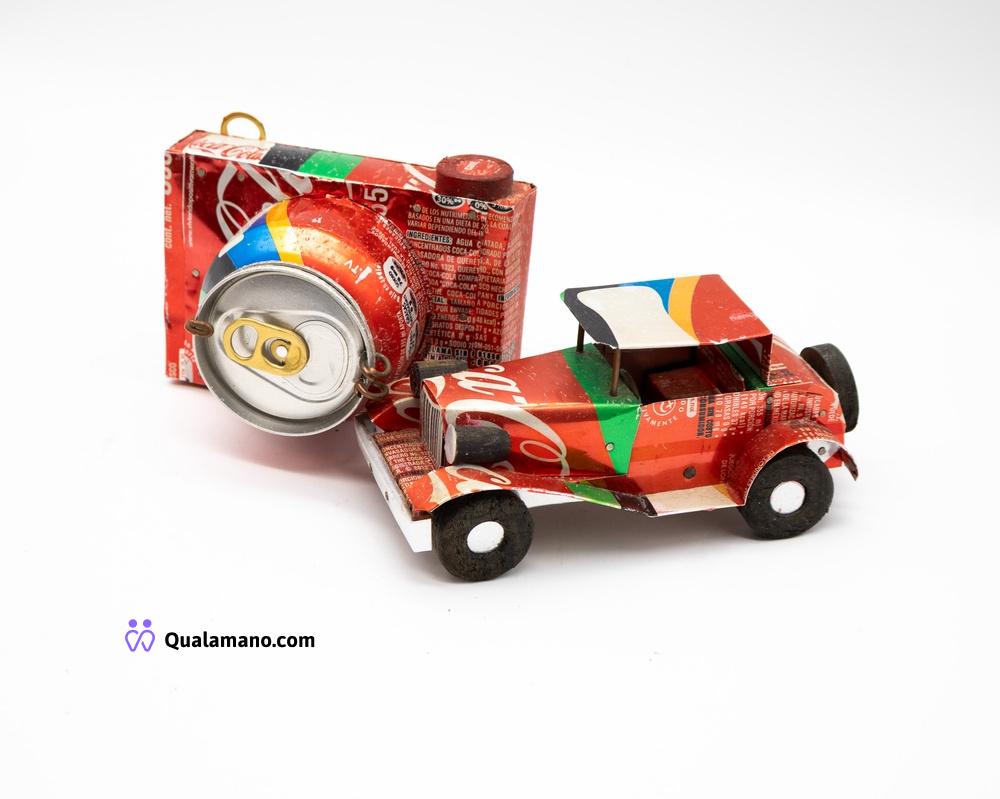 Gadget ecosostenibili composti da un’auto e una macchina fotografica in miniatura Coca Cola