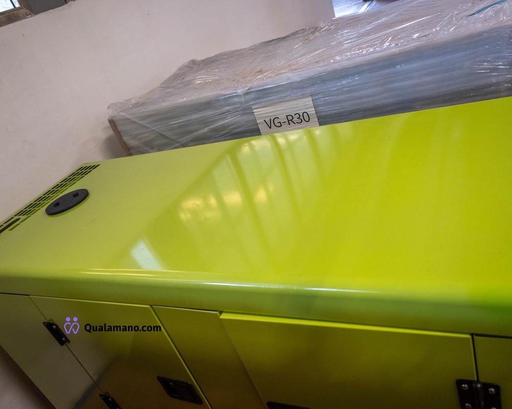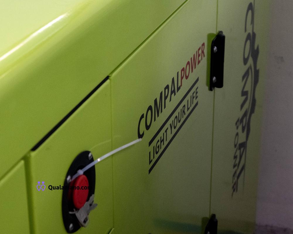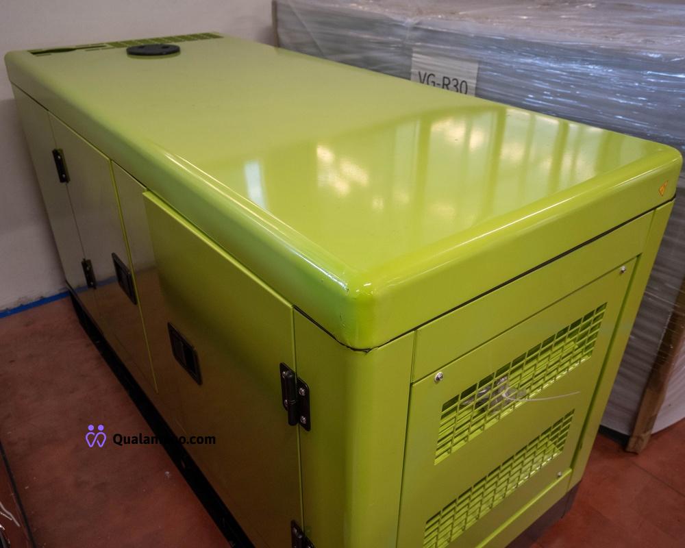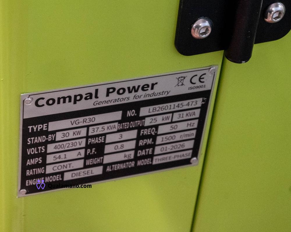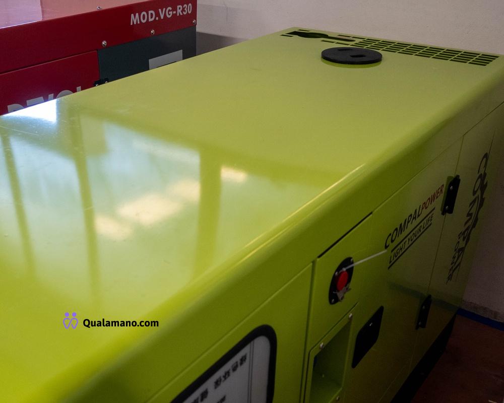 Generatore elettrico COMPAL POWER VG-R30 - super silenziato - accensione elettronica - motore ricardo 4 cilindri raffreddato ad acqua - motore con sistema riduzione consumi - uscite 400/230 Volt - potenza 30-41Kw – 37,5 KVA – colore verde fluo - nuovo con 0 ore di attività – numero di serie LB2601145-473