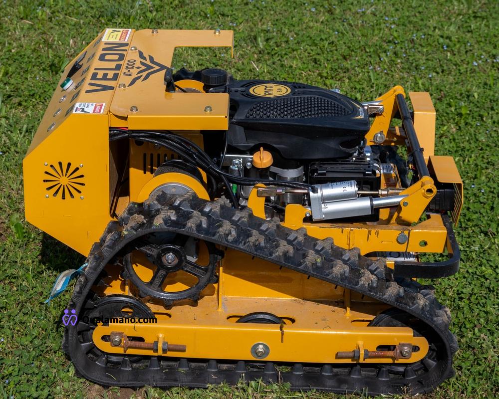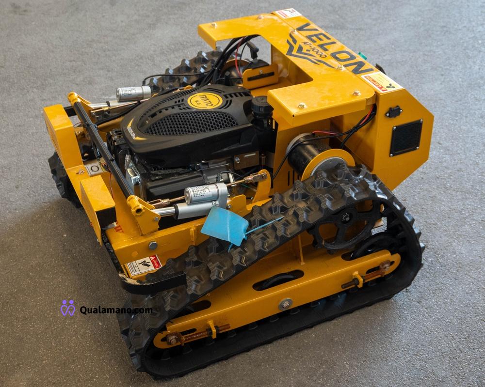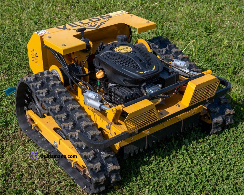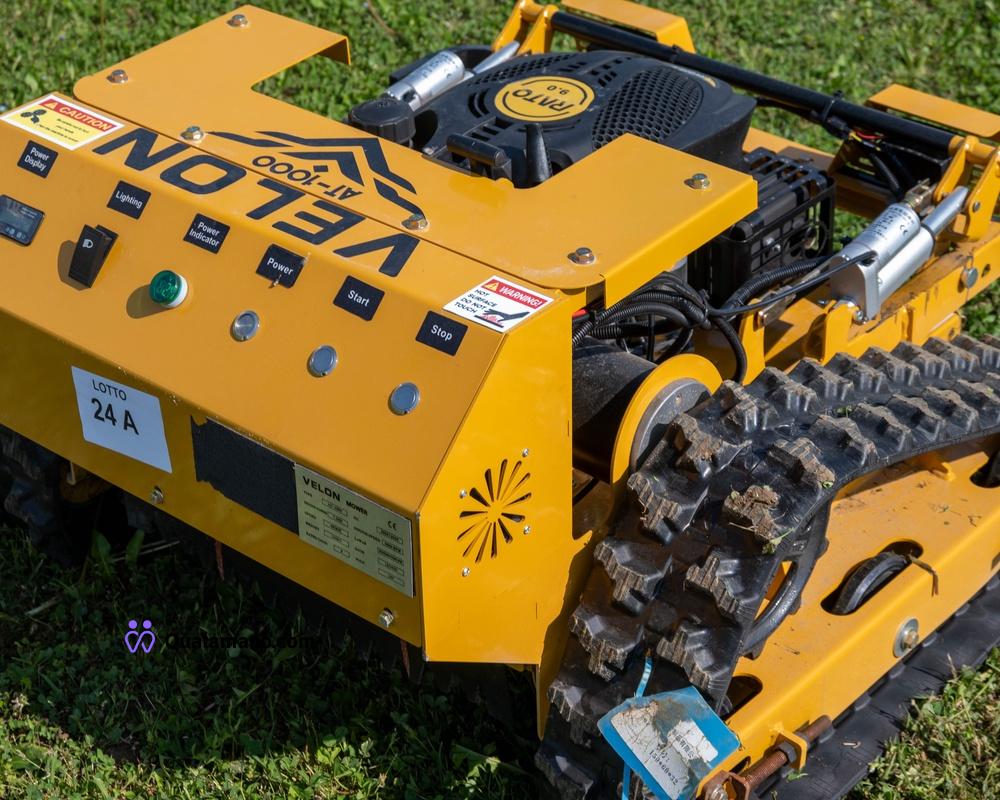 Falciatrice radiocomandata modello Velon AT-1000 - doppio cingolo trainante - motore gasoline - accensione elettronica - radiocomando digitale - altezza lama elettro regolabile – engine power 7,5 Hp – velocità 6Km/h – peso 130Kg – engine speed 3600 RPM – 12 Volt