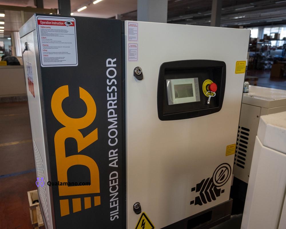 Compressore a vite super silenziato drc con essiccatore - alimentazione 380 volt - 7, 5 kW 10 hp con serbatoio 330 litri - pannello digitale per comandi - inverter per gestione motore -pressione 8 bar – nuovo con 0 ore di attività - free air delivery un metro cubo al minuto – peso 380Kg – identificativo del prodotto BBCT63747499