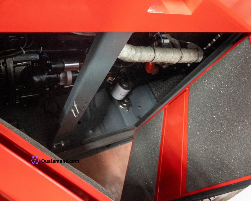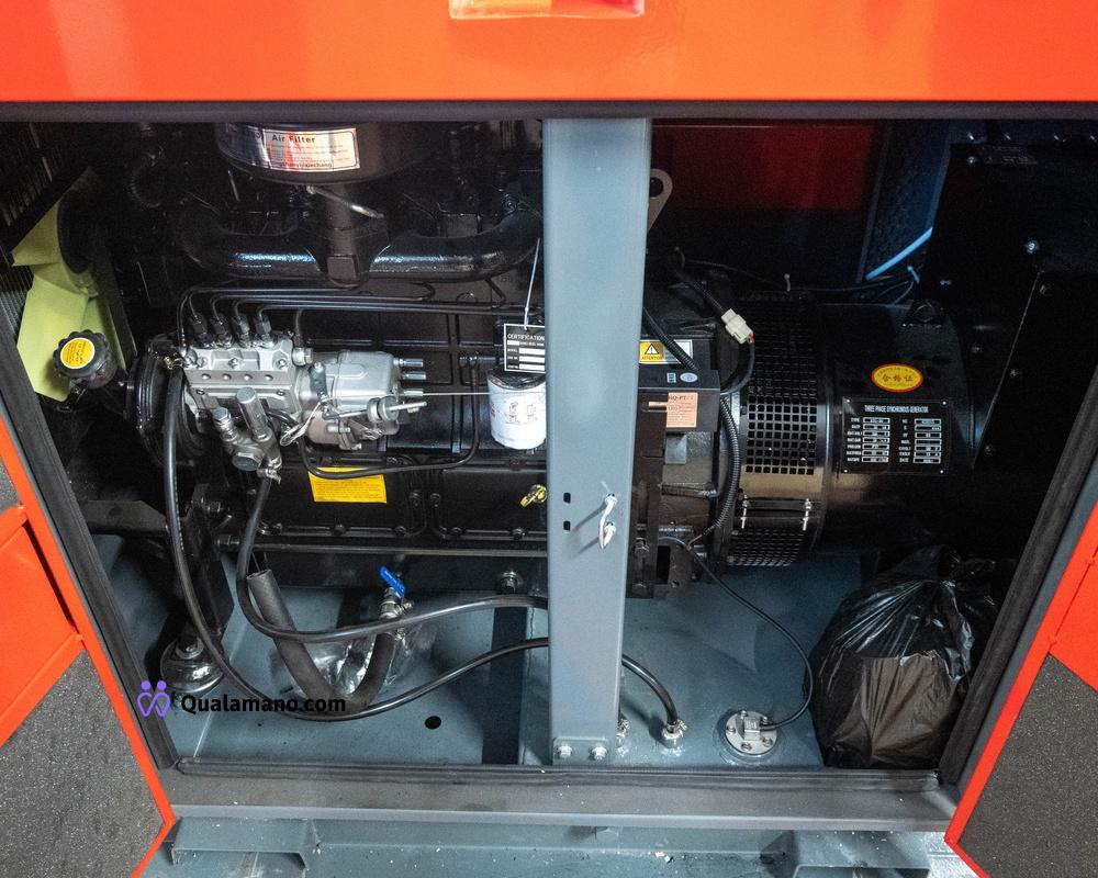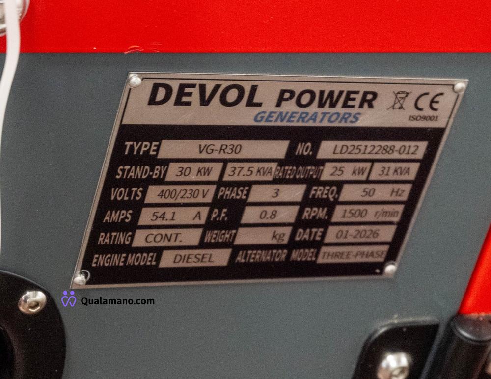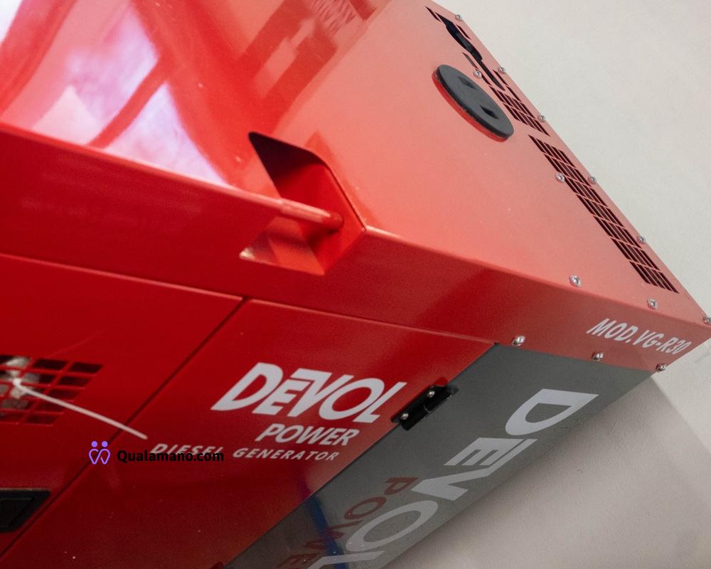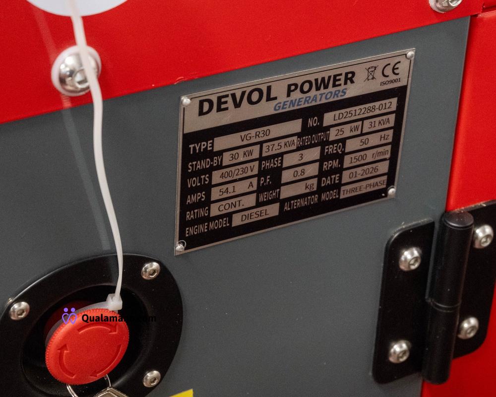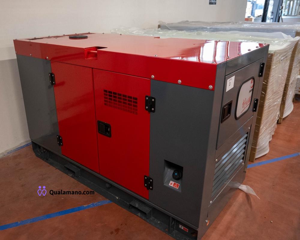 Generatore elettrico DEVOL VG-R30 - super silenziato - accensione elettronica automatica - motore ricardo 4 cilindri raffreddato ad acqua - motore con sistema riduzione consumi - uscite 400/230 Volt - potenza 30 kW-41 – 37,5KVA – colore rosso e grigio - nuovo con 0 ore di attività – numero di serie LD2512288-012